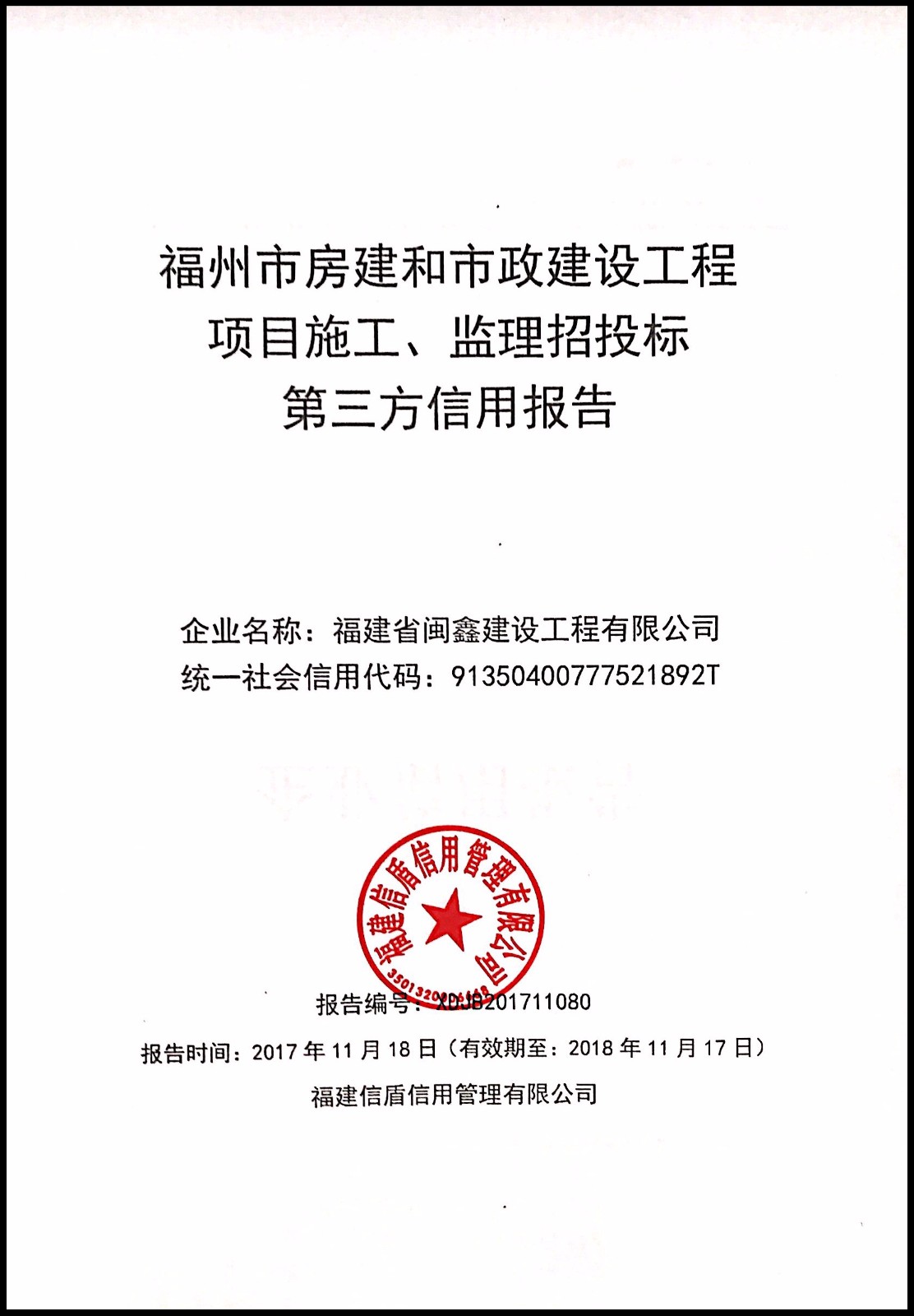 福建省閩鑫建設工程有限公司 XDJB201711080