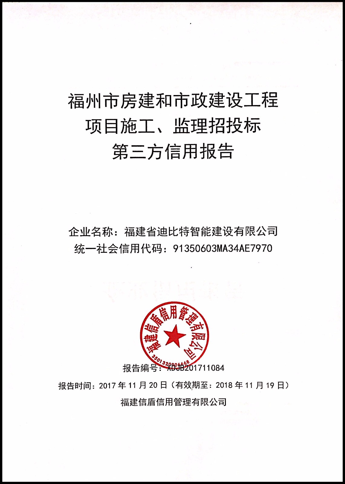 福建省迪比特智能建設有限公司 XDJB201711084