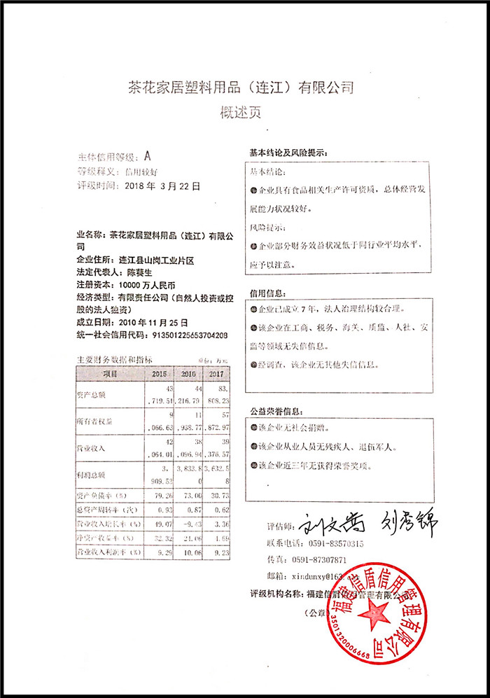茶花家居塑料用品(連江)有限公司 XDPJ201803208